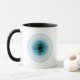 Un ojo cibernetico azul con varias pantallas digitales, incluyendo círculos, puntos y cuadrados, algunos iluminados y otros no, con un pequeño cruce en el medio y la palabra "visión" hacia atrás en la parte inferior derecha.