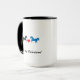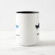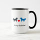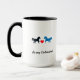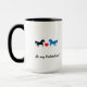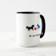 Dos caballos pintados digitalmente -uno azul claro y el otro azul muy oscuro- se enfrentan unos a otros sobre un corazón rojo, con las palabras "Sé mi Valentín". Esta taza puede ser utilizada por una persona de mano izquierda o derecha, ya que el mismo diseño está a ambos lados de la taza. Puede insertar fácilmente sus propias palabras y cambiar el color del fondo.
