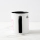Una atractiva taza de ringer blanca con un labio negro y un mango y "me gusta el café" en galés. Las letras están llenas de puntos rosados de polka.