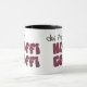 Una atractiva taza de ringer blanca con un labio negro y un mango y "me gusta el café" en galés. Las letras están llenas de un patrón geométrico rojo y verde. Puede que prefiera cambiar el color de fondo utilizando el botón Personalizar y, a continuación, el botón Editar > Fondo.