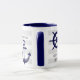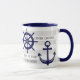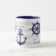 Este diseño decorativo incluye un ancla azul marino oscuro y una rueda de barco con rayas grises y blancas. El ilustracion náutico crea una taza de café única y moderna con texto personalizado y color de fondo.