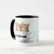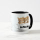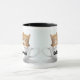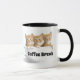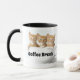 Esta taza de café de cerámica se muestra con una foto impresa de tres gatitos lindos amarillos en una taza grande sobre un fondo blanco. Texto de "Pausa de café". Imágenes y texto en dos lados de la taza que envuelven. Elija su interior y maneje el color que se muestra en negro. Personalizar este artículo o compra tal cual.