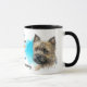 Un retrato acuarela de un hermoso Perro Cairn Terrier es la característica en dos lados de esta taza. Cada imagen se coloca sobre un fondo de bandeja azul brillante. Entre las dos imágenes está el texto que describe a este compañero leal y juguetón, con "el perro CAIRN TERRIER" en negro en la parte inferior. ¡Todo el texto se personaliza fácilmente a cualquier cosa que prefieras para que puedas personalizarlo o describir a tu propio amigo fiel!