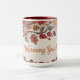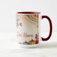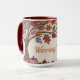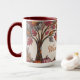 Esta taza presenta un estilizado ilustracion con temática otoñal con un árbol como pieza central. El árbol tiene ramas de colores y hojas multicolores en tonos rojos, naranjas, amarillos y grises. En la parte inferior hay calabazas en naranja, rosa, gris y marrón con bellotas y bayas rojas. El texto Calentando tu hogar está en letras cursivas. Hay un patrón giratorio en los colores otoñales, pasando del rojo al naranja al amarillo sobre un fondo de color crema. La taza es un tazón combinado marrón. La dimensión de una taza de 15 onzas es de 3,4" por 4,5". La taza está equipada con microondas y lavavajillas. La taza cumple con los requisitos de la FDA para la seguridad de los alimentos y bebidas.
