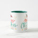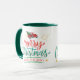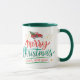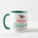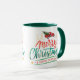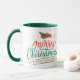 Esta singular taza de café muestra una tipografía estilizada que dice "Feliz Navidad y Feliz Año Nuevo" en rojo y verde verde azulado. Encima del texto hay una pequeña imagen de un camión rojo retro con un árbol de vacaciones recién cortado. Los giros de oro y las estrellas añaden interés. Las imágenes y el texto están impresos en dos lados de la taza. Clásica y elegante para la temporada de vacaciones.