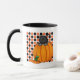 Camisetas de Halloween coloridas, tazas, tarjetas, pegatinas, bolsos de truco o de regalo, imanes y otras prendas y regalos de Halloween con un lindo gato negro en calabaza y diseño de puntos naranjas y negros.