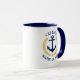 Una taza de café de dos tonos personalizada con rango de capitán u otro título, su nombre de barco, nombre de familia u otro texto deseado. Con un ancla náutica diseñado por un personalizado, hojas de laurel de estilo dorado y emblema de estrellas. Hay varios colores de acento para elegir entre la decoración actual. Hace un gran regalo para cualquier ocasión.