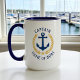 Un tazón de café grande de 15 onzas personalizado de dos tonos con rango de capitán u otro título, su nombre de barco, apellido u otro texto deseado. Con un ancla náutica diseñado por un personalizado, hojas de laurel de estilo dorado y emblema de estrellas. Hay varios colores de acento para elegir entre la decoración actual. Hace un gran regalo para cualquier ocasión.