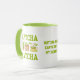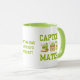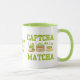 Fun CAPTCHA DA MATCHA Fun Latte Drinker Mug con TEXTO de PERSONALIZABLE, para bebedores de té de café con leche matcha. El diseño muestra tres imágenes de café mate y hojas en medio de texto verde negrita leyendo CAPTCHA DA MATCHA. El texto intermedio es PERSONALIZABLE, por lo que puede PERSONALIZAR con su propia redacción o borrarlo.