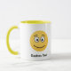 Una cara sonriente, con los ojos abiertos. Texto personalizado en ambos lados.
