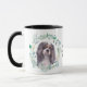 "CAVALIER KING CHARLES SPANIEL" es el texto en el centro de esta taza. Cada lado de la taza tiene un hermoso retrato de acuarela de un adorable espátula tricolor en una corona azul de hojas verdes. Entre las dos imágenes está el texto, que puede ser fácilmente personalizado, o incluso eliminado, por usted.