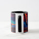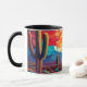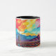 Hermosos colores de Arizona puesta de sol en colores abstractos de naranja, amarillo y azul. La taza cerámica tiene negro dentro y en la manija. Imagen diseñada por mí con un generador de IA.