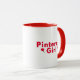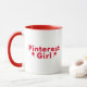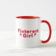 Chica de Pinterest en los colores clásicos de Pinterest con dos pines a juego a cada lado. Interiorismo que coincide y maneja colores en una taza blanca limpia. Disponible en muchos estilos de taza y colores de manejo y decoración.