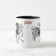 Una imagen artística de un caballo negro estilizado es el fondo del símbolo chino para el caballo rojo en esta taza. Entre las imágenes idénticas de cada lado en rojo está "2026", el año del caballo en el zodiaco chino. El texto es personalizable, por lo que puede cambiarlo o eliminarlo si lo desea.