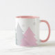 This ceramic coffee mug is shown in a refreshing image of woodlands fir tree print. Snowflakes grace the mug cascading down from the rim.