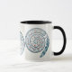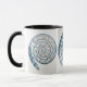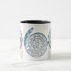 Una pintura akvarel de fondo limpio de un patrón nativo americano. El patrón consiste en un círculo con una pluma dentro, y el círculo está rodeado por una espiral. La espiral se llena con espirales más pequeñas y el patrón general se llena con una variedad de formas geométricas. El fondo es blanco.
