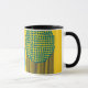 Esta taza tiene un diseño moderno de mediados de siglo de círculos con líneas que salen de ellos en verde azulado y negro sobre un campo de oro.