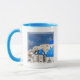 Las iglesias con techo azul están por todas partes en la isla. Las ciudades abrazan las empinadas montañas. Santorini. Grecia. Crédito como: Tom Norring/DanitaDelimont.com