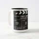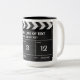 Taza CLÁSICA de CLAPPERBOARD con su texto. Añada su acontecimiento o producción, los nombres, las fechas, diseño del etc. disponible en otros artículos. Único a la gloria.