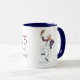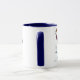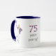 Esta taza blanca de ringer, con el labio y el mango azul oscuro, es un gran regalo de cumpleaños para un niño de 75 años. La imagen, en la parte trasera y en la parte delantera, es de un "hombre mayor" bailando, en un gorra de chaqueta y agua, desde un ilustracion acuático de Judy Adamson. Entre los dos hombres está el texto - ¡75 años joven!