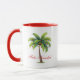 El tazón de café se muestra en blanco con rojo en el interior, con una huella de palmeras vacacionales. El texto dice Feliz Navidad. Personalizar esta taza o compra como está.
