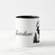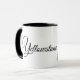 Esta taza de café de cerámica se muestra con una impresión de arte de una alce con texto de piedra amarilla. Interior negro y manija. Personalizar este artículo o compra tal cual.