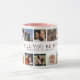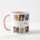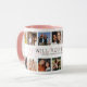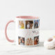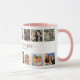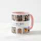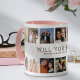Taza de regalo para dama de honor con 14 fotos para reemplazar con las tuyas, el texto "¿serás mi dama de honor?" en una fuente elegante rosa claro, y una propuesta personalizada.
