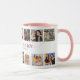 Taza de regalo para dama de honor con 14 fotos para reemplazar con las tuyas, el texto "¿serás mi dama de honor?" en una fuente elegante de color rosa claro, y una propuesta personalizada.