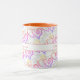 Este divertido diseño presenta dos patrones de corazón vinculados. El patrón superior más grande tiene un corazón de color arcoiris pastel y detrás están ligados corazones delineados de negro con texto de plantilla a ambos lados de la manija. Personalice el texto o haga clic en personalizar para seleccionar un estilo de fuente, tamaño y color que prefiera. Seleccione entre una variedad de estilos de taza para adaptarse a su gusto.