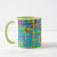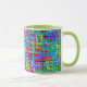 This colorful grid coffee mug features a vibrant multicolor geometric pattern wrapped around the cup with a fresh lime green handle and interior, creating a bold modern look that instantly brightens any drink break. A fun abstract design for coffee lovers who enjoy playful color and contemporary style.