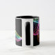 Un interesante diseño abstracto de rayos de luz coloridos y fluidos se sitúa en un fondo negro dramático en esta taza de café. Tu nombre está en azul en el centro. Único y atractivo.