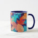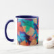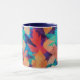 Hojas coloridas rojas, amarillas, naranjas, azules, cian, verdes, turquesas y verde azuladas caídas de otoño sobre un fondo azul oscuro y violeta. Pintura fantástica.