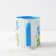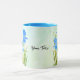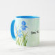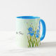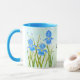 Una taza con imágenes de hermosos iris azules. El fondo, la imagen y el texto se pueden personalizar. Arte original de W.B.