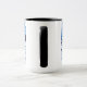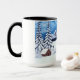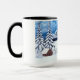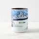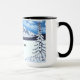 Una taza con una hermosa escena invernal que incluye montañas nevadas, cabaña rústica y pinos cubiertos de nieve. Arte original de W.B.