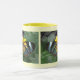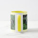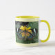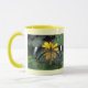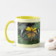 Mariposa con las alas transparentes, encendidas en la flor amarilla brillante. Foto a ambos lados de la taza con la manija amarilla brillante.