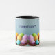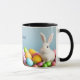 Imagen de un conejo blanco en una canasta de mimbre con vibrantes huevos de Pascua, rodeado de flores y vegetación. Perfecto para celebraciones de temporada, temas primaverales o conceptos festivos.