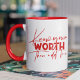 Know Your Worth Inspirador Motivational Quote Coffee Mugs (Conoce tu valor y después agrega impuestos) presenta un moderno guión rojo de caligrafía con el gracioso comentario positivo "Conoce tu valor". Diseñado por Evco Studio www.zazzle.com/store/evcostudio
