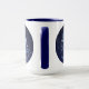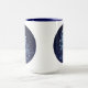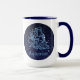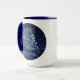 Mug con el símbolo zodiaco para Aquarius en azul plateado suave, como un medallón redondo, cubierto con las estrellas de la constelación, contra un fondo cielo estrellado clasificado de azul oscuro a negro.