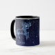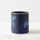 Mug con el símbolo zodiaco para Aries en azul plateado suave, cubierto con las estrellas de la constelación, contra un fondo estrellado del cielo clasificado de azul oscuro a negro