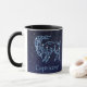 Mug con el símbolo zodiaco para Capricornio en azul plateado suave, cubierto con las estrellas de la constelación, contra un fondo estrellado del cielo clasificado de azul oscuro a negro