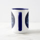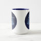 Mug con el símbolo de zodiac para Libra en azul plateado suave, como un medallón redondo, cubierto con las estrellas de la constelación, contra un fondo estrellado del cielo clasificado de azul oscuro a negro.