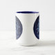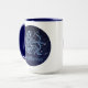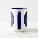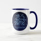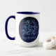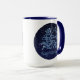 Mug con el símbolo de zodiaco para Sagittarius en azul plateado suave, como un medallón redondo, cubierto con las estrellas de la constelación, contra un fondo cielo estrellado clasificado de azul oscuro a negro.