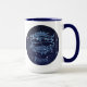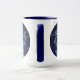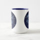Mug con el símbolo de zodiac para Pisces en azul plateado suave, como un medallón redondo, cubierto con las estrellas de la constelación, contra un fondo cielo estrellado clasificado de azul oscuro a negro.
