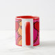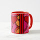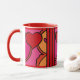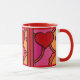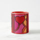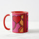 ¡Qué Diversión! El diseño de esta gran taza de cerámica es tan alegre y alegre que no se puede sonreír. El arte original de Leslie Sigal Javorek es un estilo abstracto de arte pop con corazones de color rojo ketchup y tonos cálidos de rosa caliente, naranja y negro contra porcelana blanca brillante.