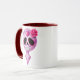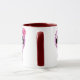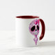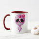 Este cráneo púrpura adorable del azúcar se adorna con remolinos y descensos tribales con un corazón violeta grande en el medio de la frente. Un solo rosa rojo se sienta en el lado del cráneo redondo apenas sobre los ojos morados grandes. Los pedales de la flor rodean los ojos y la boca tiene puntadas que hagan su manera encima del lado de la mejilla. Este diseño de la taza es un ejemplo adorable de este día del símbolo muerto.