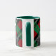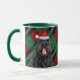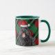 Un perro del Terrier Ruso Negro muy dulce en Santa hat contra una manta de temporada roja y verde, listo para desear a los amantes del perro una temporada de agitación de cola.