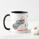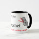 Esta taza blanca está decorada con imágenes en blanco y negro de manchas de lana, cada una con dos ganchos rojos de crochet y las palabras "Crochet porque tejer no es lo suficientemente emocionante". Es una tontería humorística dar a alguien que ama el crochet, y puede ser personalizado con cualquier nombre.