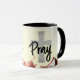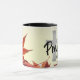 Oración inspiradora: tazón de café cristiano representa hojas rojas de otoño. Incluye una cruz de plata con el mensaje de "Rezar".