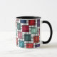 Esta taza tiene un diseño art deco de cuadrados hechos de ángulos superpuestos en tonos retro de azul y rosa.