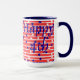 Imágenes creativas, diseñadas así, arte gráfico, del texto azul oscuro "Happy Cuarto", mostradas contra un patrón de bandera, rojo y blanco, rayado, con estrellas azul marino y blanco, esparcidas por todas partes.